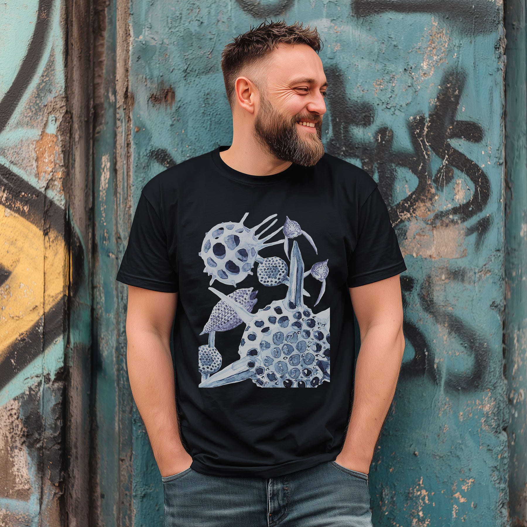 radiolaria tshirt in black, worn by a bearded man leaning against a graffit wall